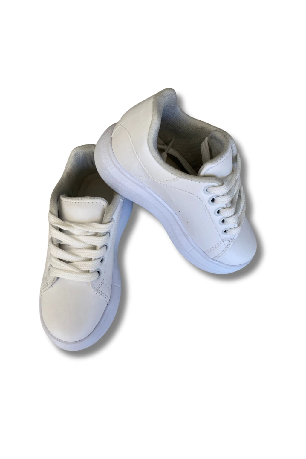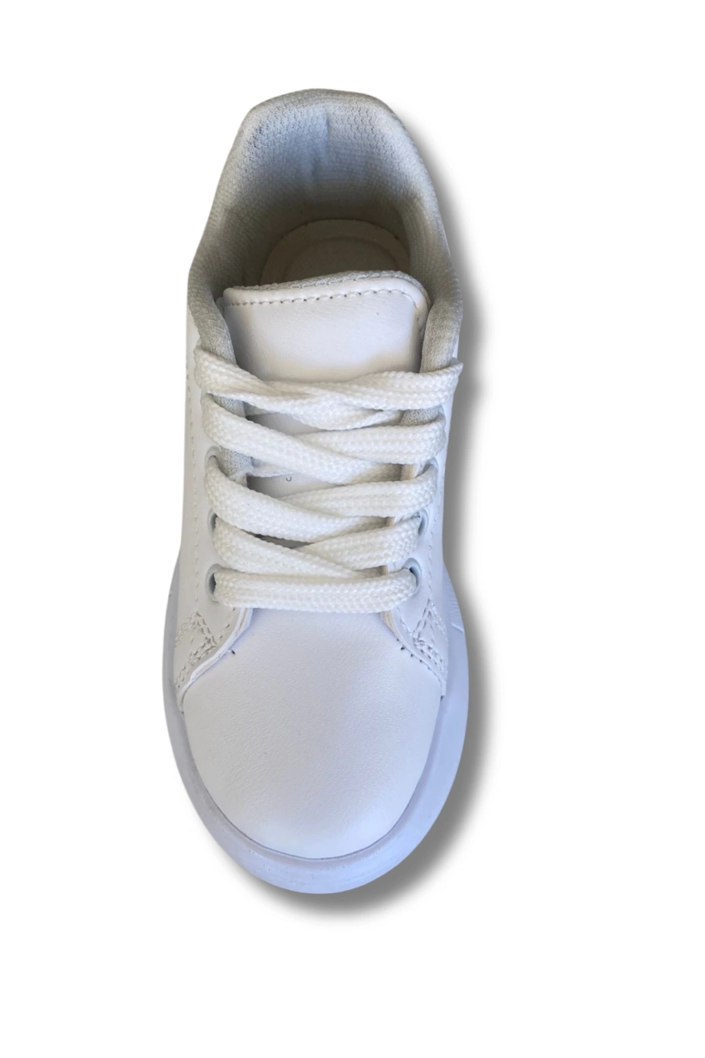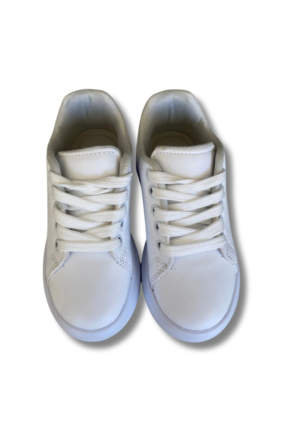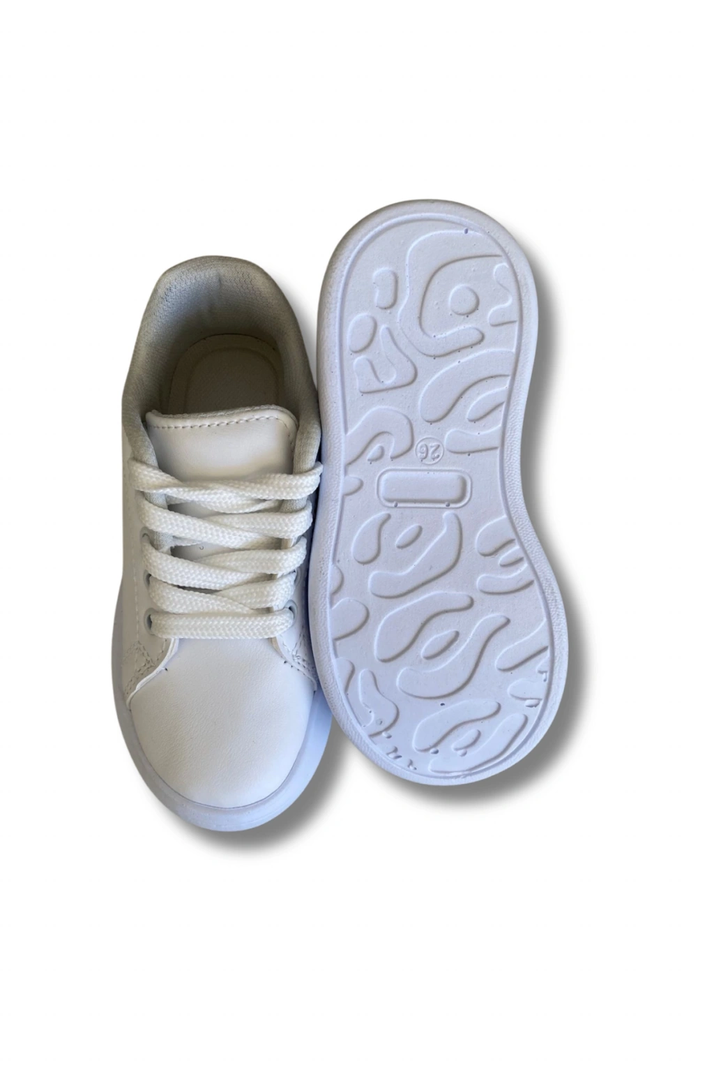 Tam beyaz tasarımı, sade ve zarif görünümüyle her kıyafetle kolayca uyum sağlar. Kaymaz taban özelliği sayesinde çocuklar farklı zeminlerde güvenle hareket edebilir.