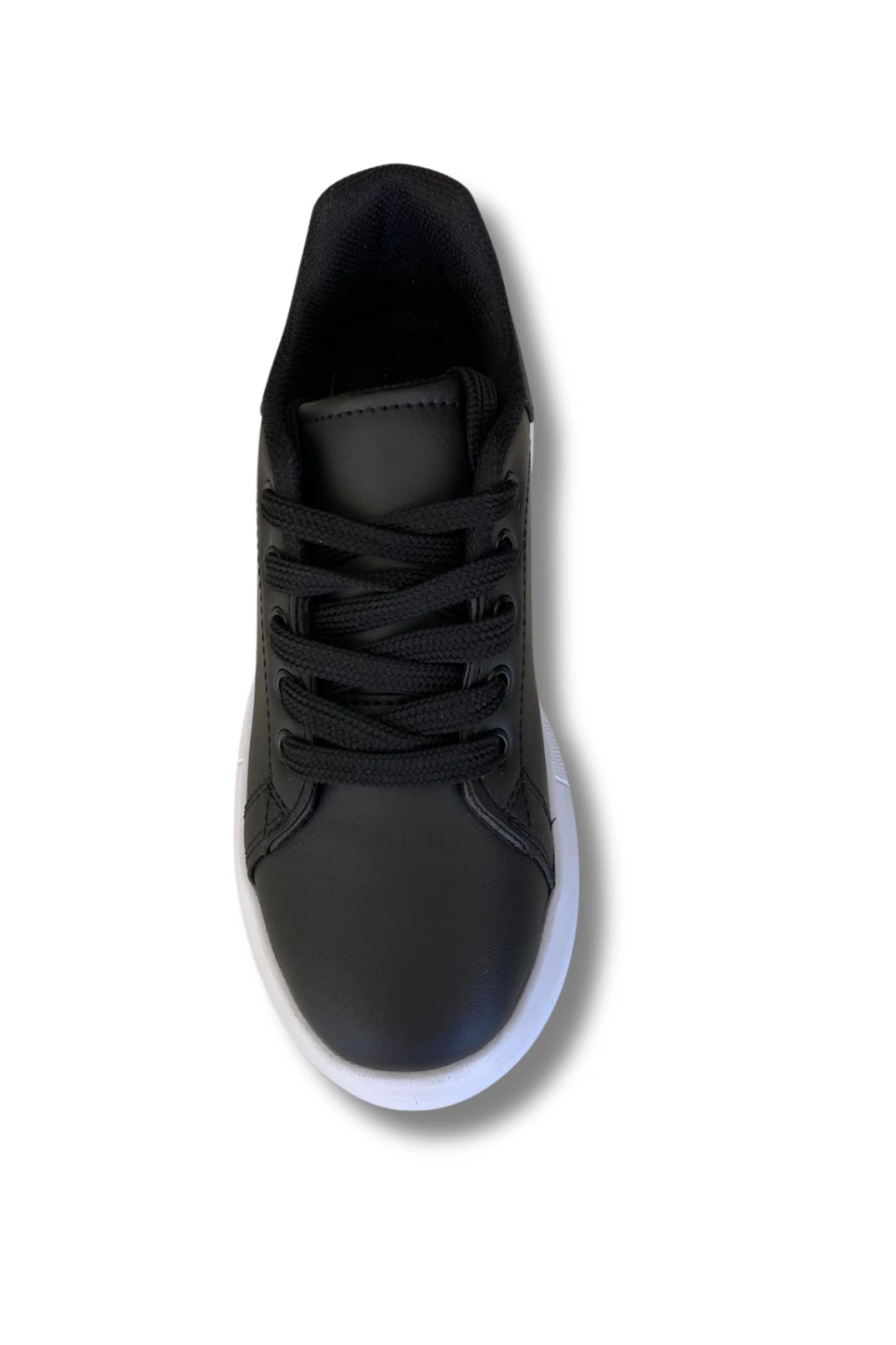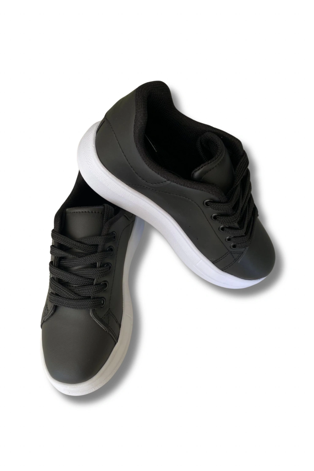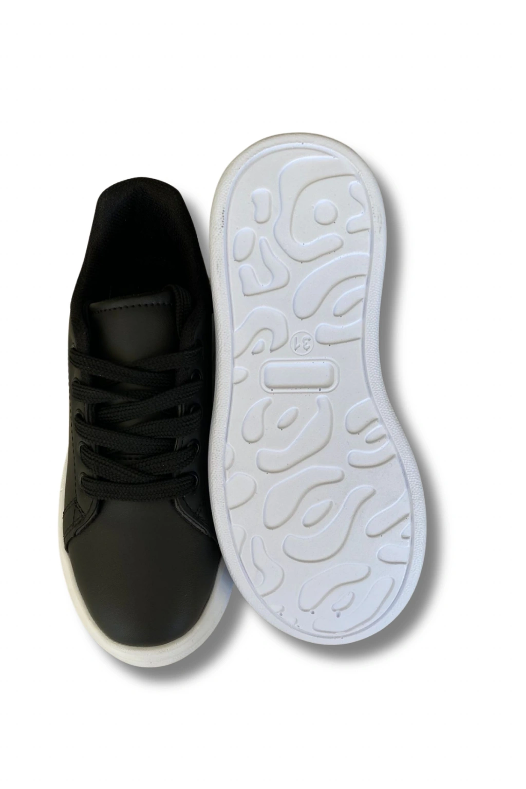 Siyah-beyaz renk kombinasyonu, her kıyafetle kolayca uyum sağlayan modern ve sportif bir görünüm sunar. Kaymaz taban özelliği sayesinde çocuklar farklı zeminlerde güvenle yürüyebilir, koşabilir ve oynayabilir.